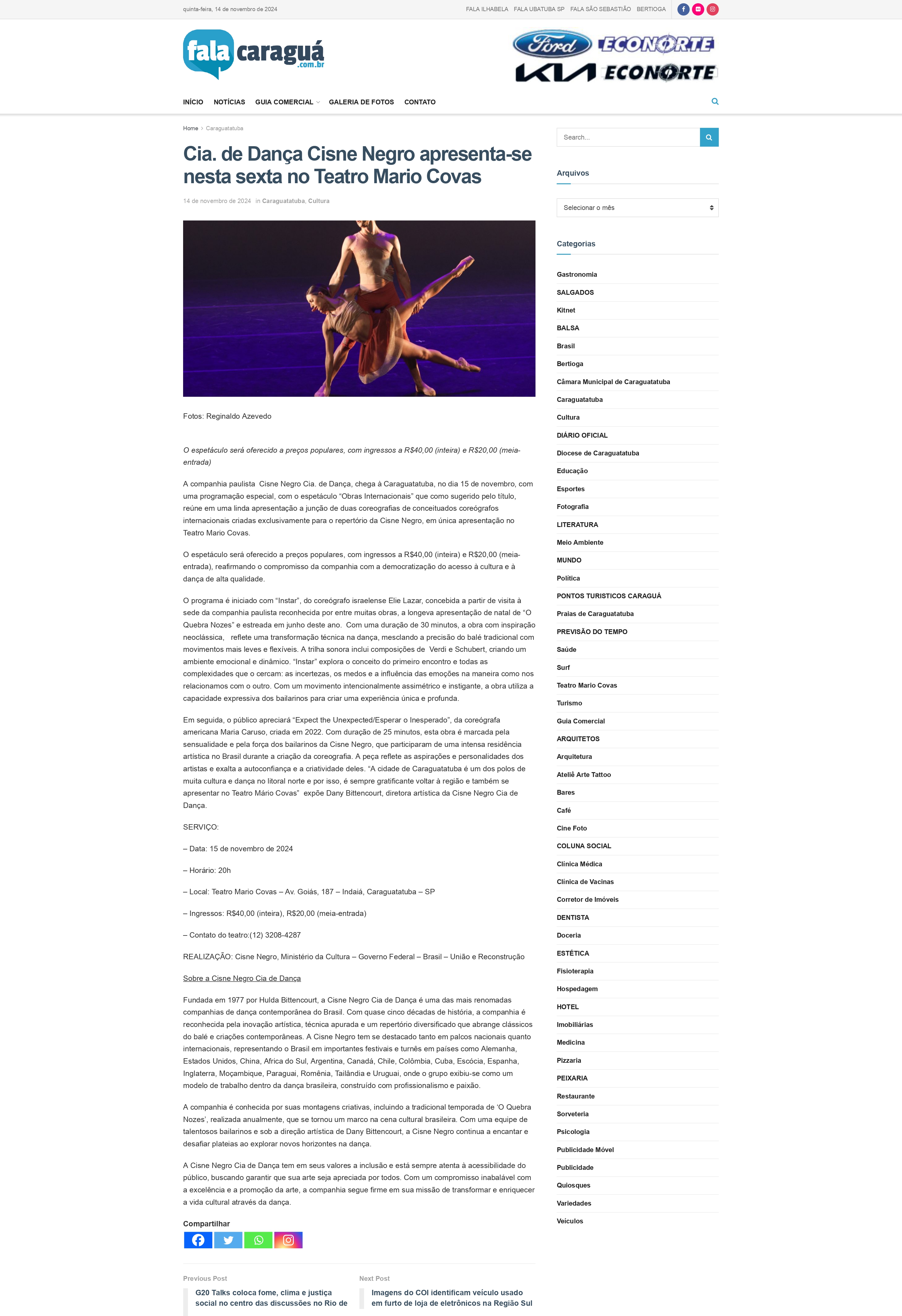 Cia. de Dança Cisne Negro apresenta-se nesta sexta no Teatro Mario Covas - Fala Caraguá