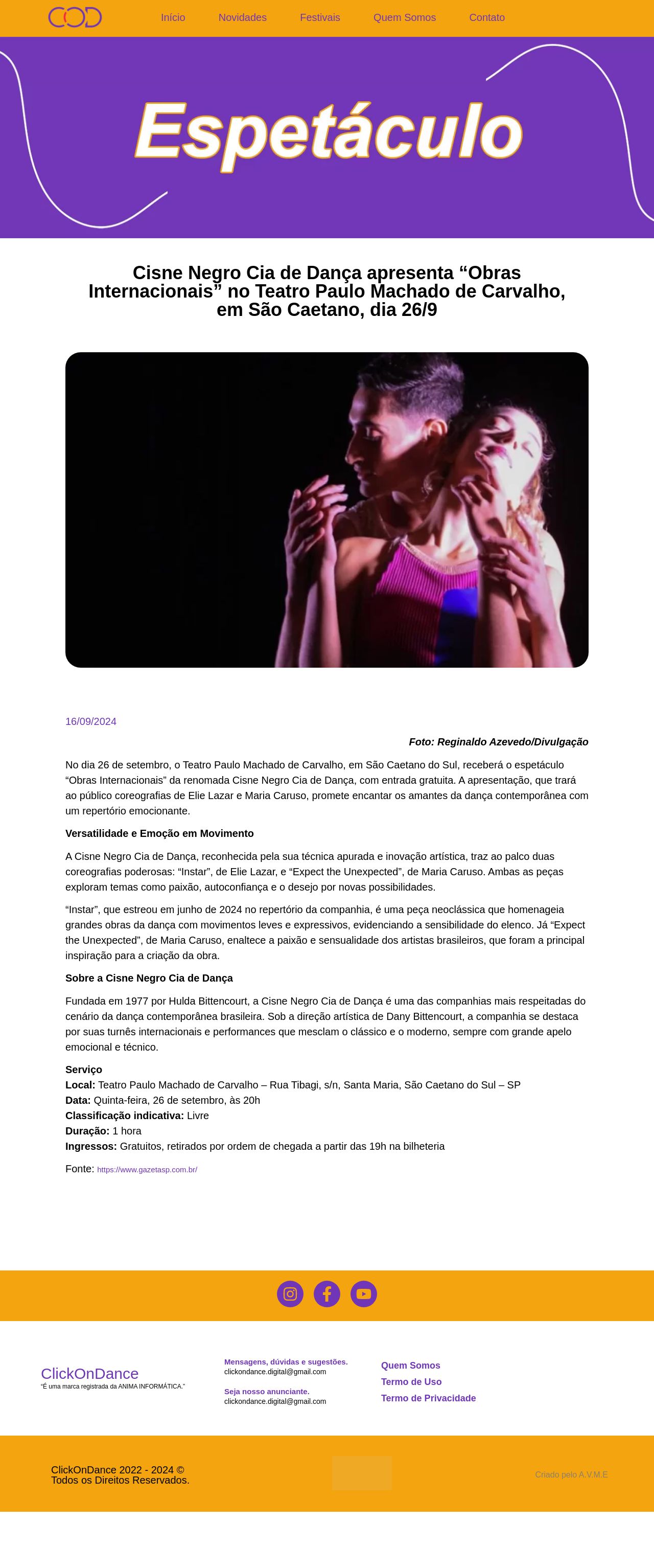 Cisne Negro Cia de Dança apresenta "Obras Internacionais" no Teatro Paulo Machado de Carvalho, em São Caetano, dia 26/9 - ClikOnDance - Noticias da Da