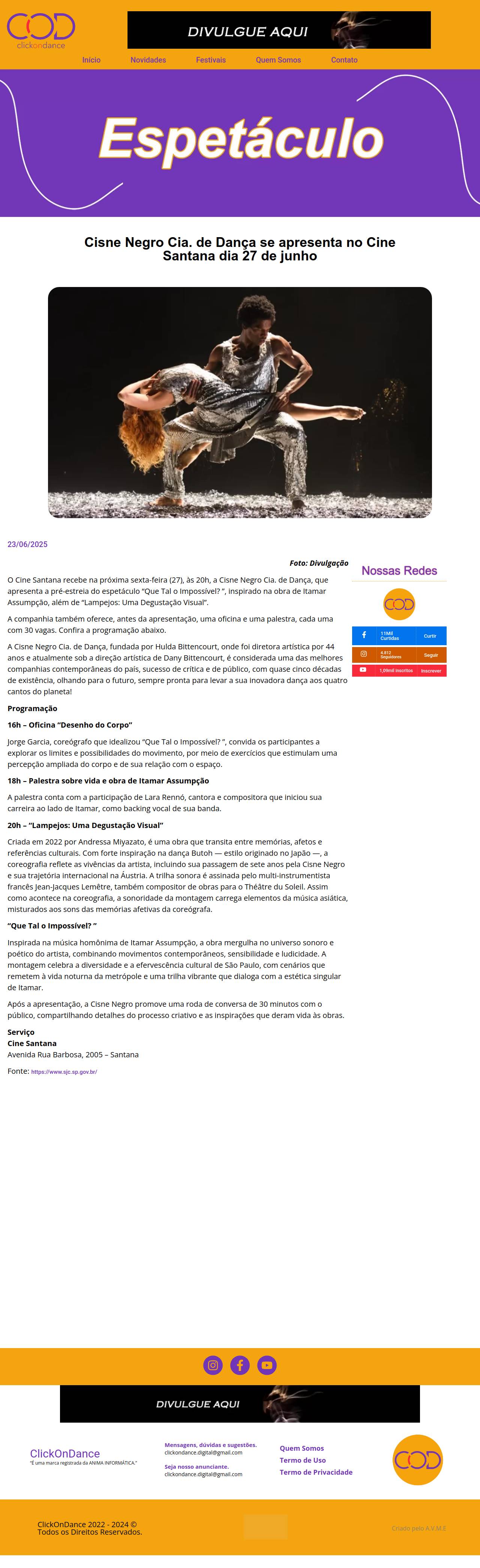 Cisne Negro Cia. de Dança se apresenta no Cine Santana dia 27 de junho - ClikOnDance - Noticias da Dança em um Clique!