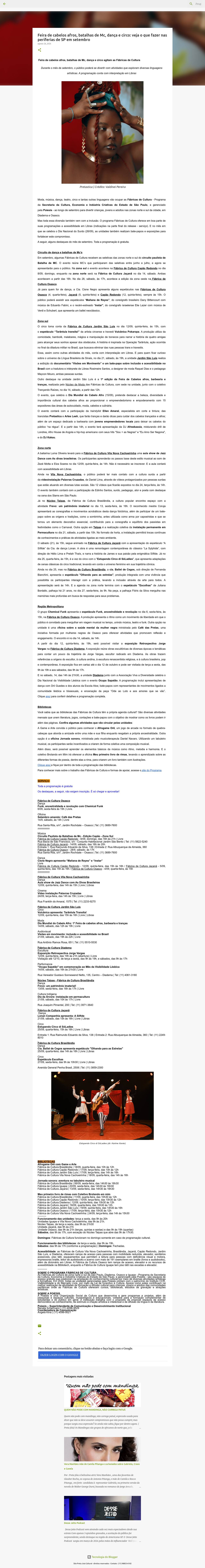 Feira de cabelos afros, batalhas de Mc, dança e circo: veja o que fazer nas periferias de SP em setembro