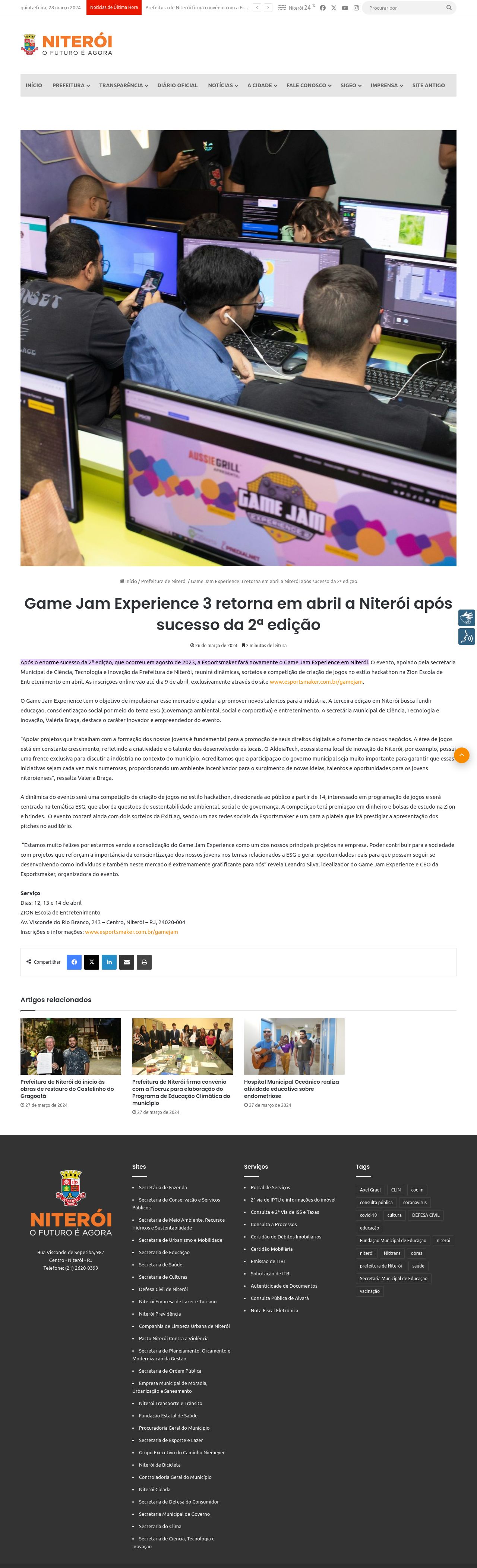 https://niteroi.rj.gov.br/2024/03/26/game-jam-experience-3-retorna-em-abril-a-niteroi-apos-sucesso-da-2a-edicao/#:~:text=Prefeitura%20de%20Niter%C3%B3i-,Game%20Jam%20Experience%203%20retorna%20em%20abril,ap%C3%B3s%20sucesso%20da%202%C2%AA%20edi%C3%A7%C3%A3o&text=Ap%C3%B3s%20o%20enorme%20sucesso%20da