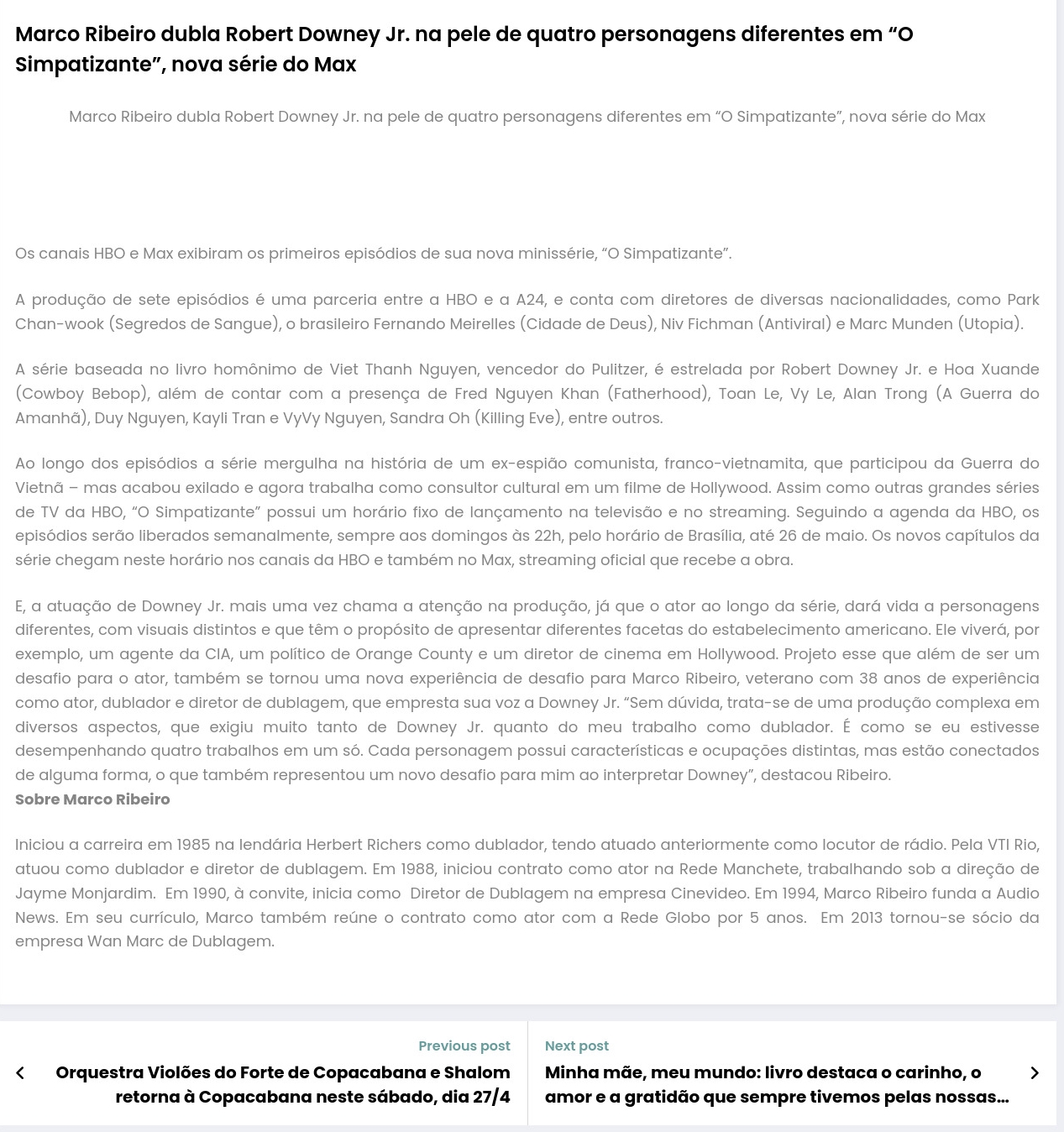 Marco Ribeiro dubla Robert Downey Jr. na pele de quatro personagens diferentes em "O Simpatizante", nova série do Max - A Capivara deu Cria