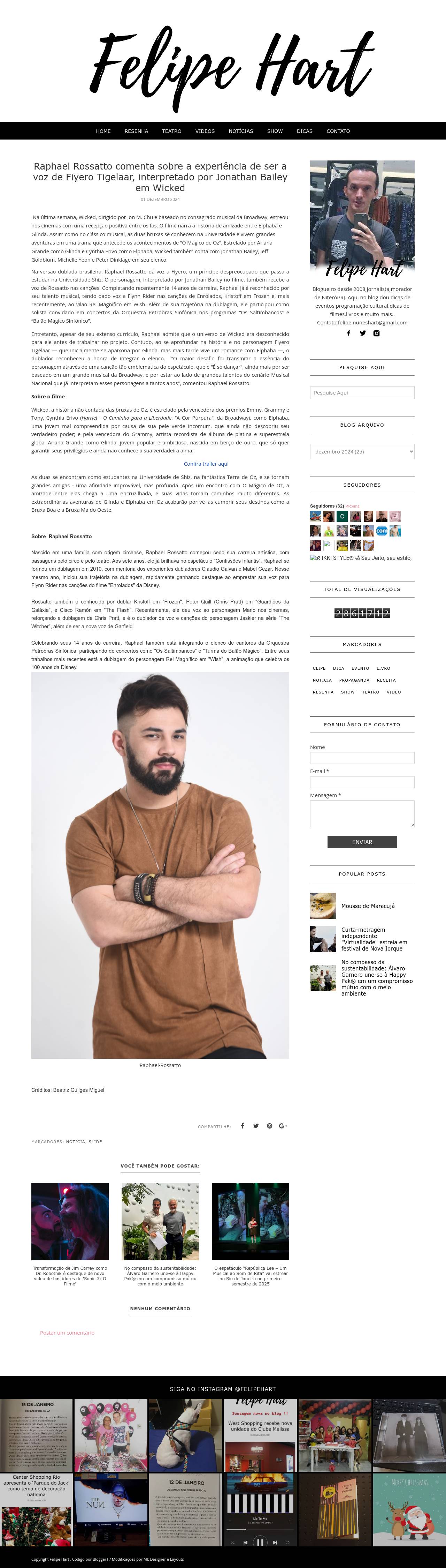 Raphael Rossatto comenta sobre a experiência de ser a voz de Fiyero Tigelaar, interpretado por Jonathan Bailey em Wicked